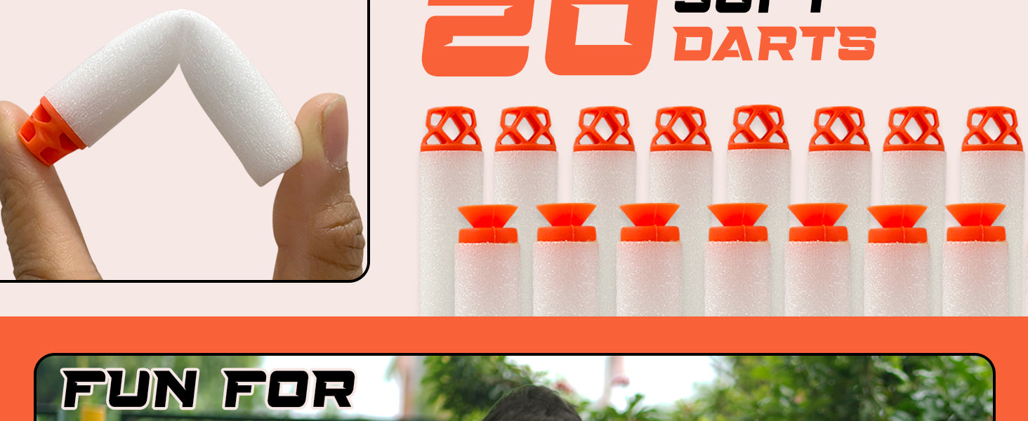 - Large Capacity Magazine: Keep the action going with a high-capacity magazine that holds up to 10 soft dart bullets at a time. This toy gun set includes 20 soft darts, ensuring you have enough ammo for extensive play sessions. Just load up, press the shoot button, and watch the darts fly!